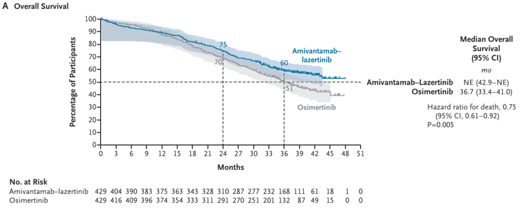 In September 2025, the overall survival results of the MARIPOSA trial were published in the NEJM. The phase 3 MARIPOSA trial evaluated amivantamab–lazertinib versus osimertinib in patients with previously untreated EGFR-mutated advanced non–small-cell lung cancer (NSCLC). With a median follow-up of nearly 37.8 months, the combination demonstrated a significant overall survival advantage compared with osimertinib alone. Three-year overall survival was 60% with amivantamab–lazertinib versus 51% with osimertinib, translating into a 25% reduction in the risk of death (HR 0.75, 95% CI 0.61–0.92; P=0.005)